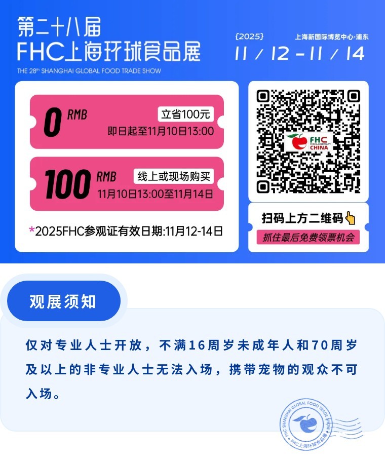 距離2025FHC上海環(huán)球食品展開展已不足30天,專業(yè)觀眾免費領(lǐng)票通道將于11月10日中午13:00正式關(guān)閉,現(xiàn)場購買參觀證需支付100元!
